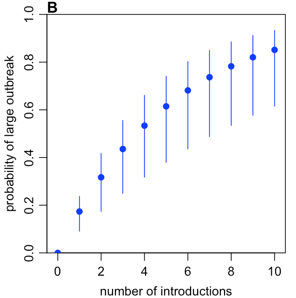 Assuming SARS-like variation and Wuhan-like transmission, we estimated that once more than three infections have been introduced into a new location, there is an over 50% chance that an outbreak will occur 7/ pic.twitter.com/YiAplVt43e