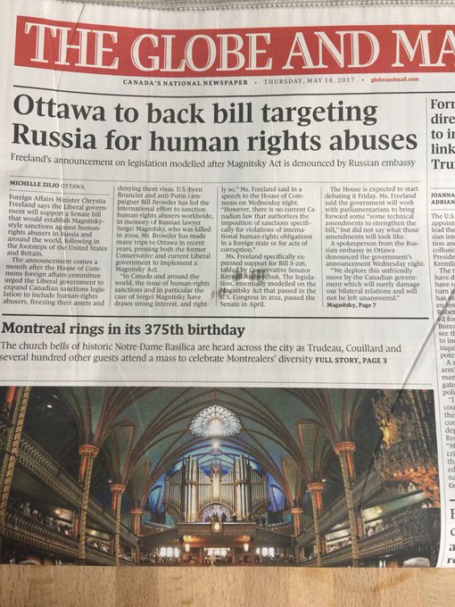 Very nice! Canadian government's announcement to pass the Magnitsky Act featured on the front page of Globe and Mail pic.twitter.com/Slgb3amEOb