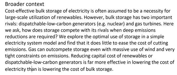 Thanks! in "How much bulk energy storage is needed to decarbonize electricity?" we find (a) that bats are *long* way from being cost effective for deep decarb of electricity, and (b) there are other ways to to very low carbon intensity.