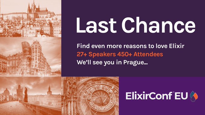 Last chance to join #Elixirlang community in Prague, great speaker line up including @josevalim @chris_mccord @expede @michalmuskala @gausby @ChrisKeathley @Tuxified @renanranelli @_polymetis_ @acscherp @_arkgil @voltonez Register now ow.ly/3BYt30okUd6 pic.twitter.com/o4I4Y5pt6N