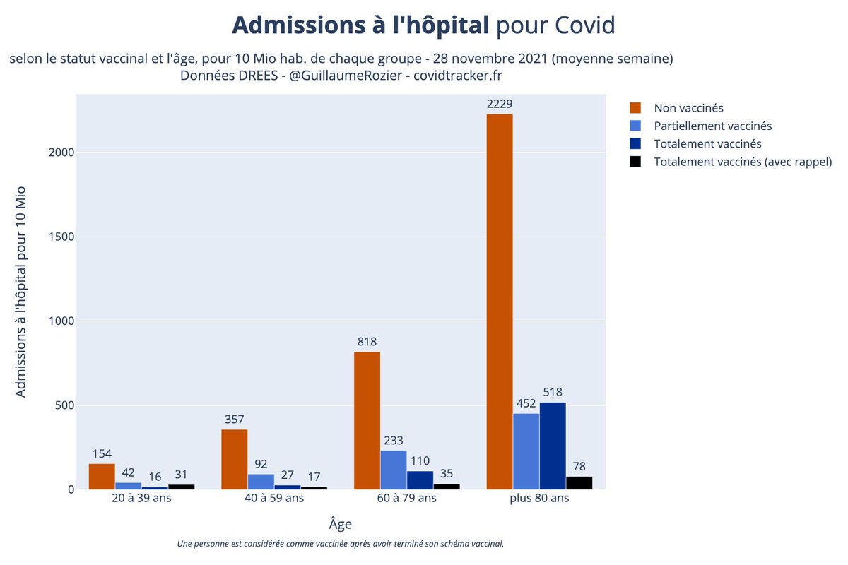 Je rappelle que les données des moins de 40 ans ne sont pas interprétables car trop faibles : il y avait peu de vaccinés triplement en novembre de cet âge là.