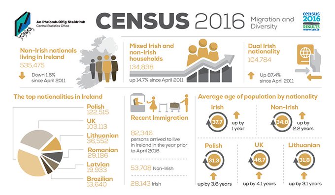 アイルランド中央統計局 は先月、最新の国勢調査に基づく移民と多様性に関する統計を発表。前回の調査と比べ、在留外国人数は減少し、アイルランドと他国の二重国籍を持つ人口は大幅に増加しました。Census 2016: Migration & Diversity