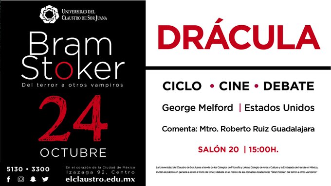 Todos son bienvenidos al ciclo de cine en @U_ElClaustro maƱana a las 15.00 #Dracula #Vampiros #BramStoker @VampireSorcha pic.twitter.com/yhiG04u9vo