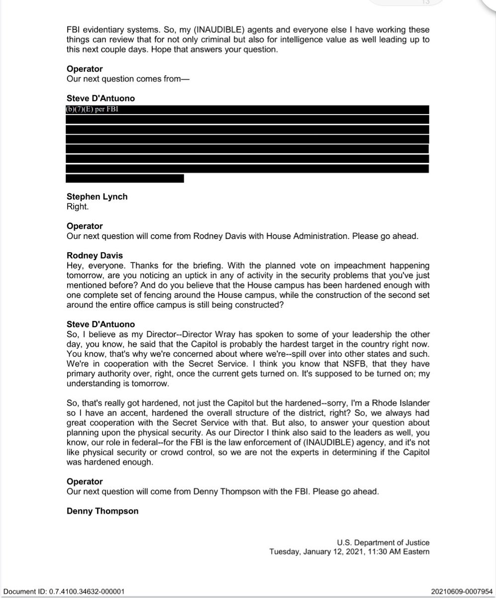 Included in our document cache is a redacted transcript of a briefing FBI and DOJ officials held for lawmakers on Jan 12 where FBI and DOJ were pressed for answers on intel failures prior to Jan 6 & what the agencies plans were going forwardpic.twitter.com/RGNTXdOS0D