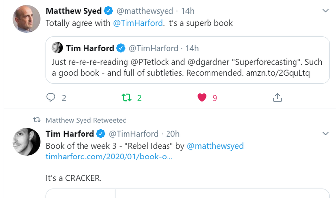 Let’s lock in a mutual-admiration triad: I think very highly of both Tim’s and Matthew’s work. And we are not only complimentary. We are complementary. Read us to discover why @matthewsyed @TimHarford pic.twitter.com/dr0A1zur1i