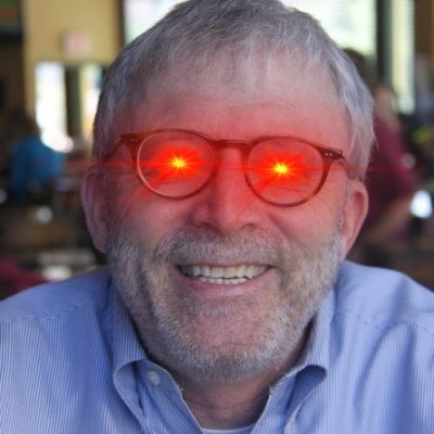 Any computer artists that can do soft (yellowish) white eyes -- kind of like an old 40 watt light bulb? Then photoshop in a pair of those old sun glasses with the lenses that can be folded up or down. I would actually use this photo on my Twitter page