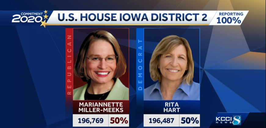 UPDATE: The race for Iowa's 2nd Congressional District is extremely close. Republican Mariannette Miller-Meeks is ahead of Democrat @RitaHartIA by 282 votes. Officials are still sorting mail-in ballots that came after #ElectionDay We're expecting a winner by Tuesday. @KCCINewspic.twitter.com/GcYl5ScQtc