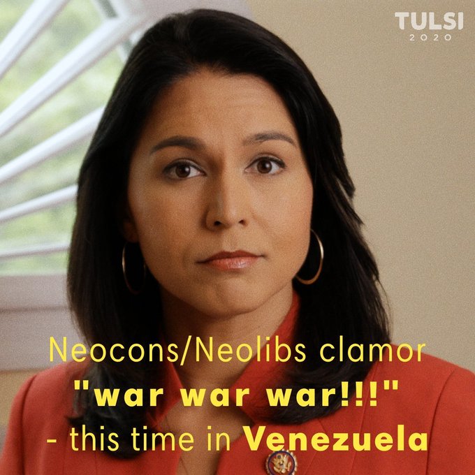Neocons/Neolibs & MSM all sing from the same songsheet: War war war!!! Trump never gets positive media unless he's threatening war/carrying out military action. Today, Venezuela. Tomorrow, Iran? Cuba? Who’s next? No wonder NK won't give up their nukes. tulsi.to/support pic.twitter.com/K4zAIk5WhN