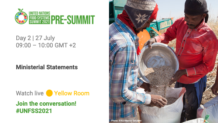 #FoodSystems transformation at the#UNFSS2021 Pre-Summit – tune in to today's Ministerial Statements and get involved in the discussion! Watch now or on-demand
