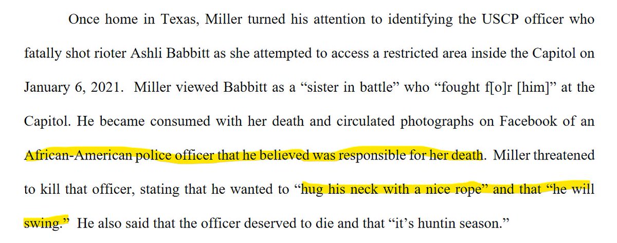 In a new filing, prosecutors say that Texas man Garret Miller wanted to locate the Black police officer he believed shot Ashli Babbitt at the Capitol and "hug his neck w/a nice rope." "He will swing," Miller wrote on Facebook.pic.twitter.com/7zXYxpI6CZ