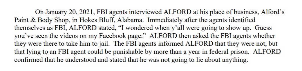 The FBI interviewed Russel Dean Alford at his place of business, Alford's Paint & Body Shop in Hokes Bluff, Ala. on Jan. 20. As soon as the agents flashed their badges, Alford said “I wondered when y’all were going to show up. Guess you’ve seen the videos on my Facebook page.”pic.twitter.com/KVe4Ny01X9