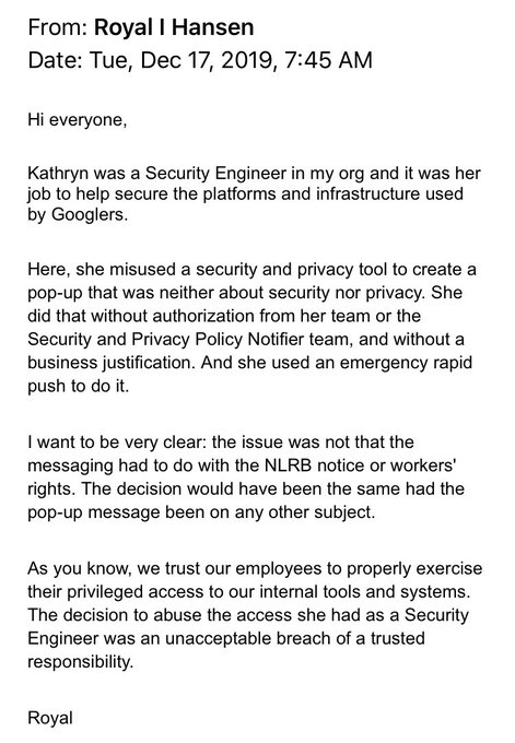 here’s a copy of an internal email google sent to its employees about firing kathryn. for context, kathryn said she wasn’t aware of these policies and google hasn’t yet pointed me to where these rules previously existed (i’ve asked) pic.twitter.com/qtzO8e5tXt
