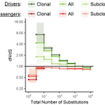We observe reduction in dN/dS in low VAF (hemizygous or subclonal) mutations too! Agreed that it could be reduced selection, but it also could be due to inefficient selection (e.g. longer residence times of neutral mutations or rapid population expansion following transformation) pic.twitter.com/qlx4dVszHc