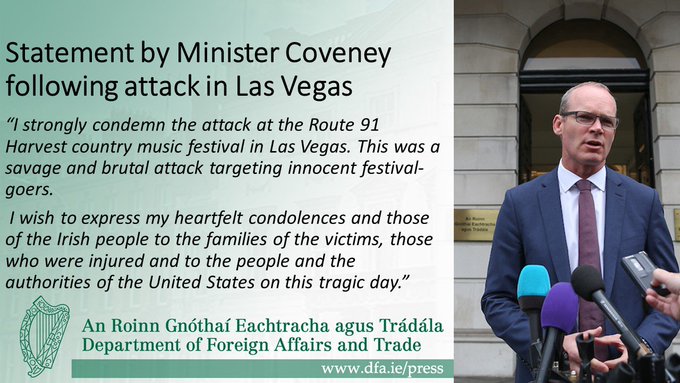 Statement of condolences by Min @simoncoveney following the attack in Las Vegas. Full statement bit.ly/2xMTh2S pic.twitter.com/dft22H1kWU