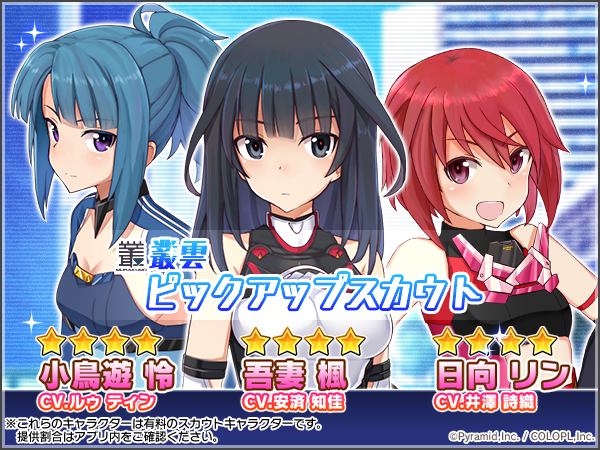 吾妻 楓(CV #安済知佳 )、日向 リン(CV #井澤詩織 )、小鳥遊 怜(CV #ルゥティン )がピックアップされた<叢雲ピックアップスカウト>を開催中!