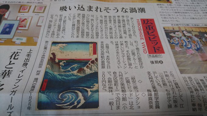 きょうのM新聞に広重ビビッド展の後期作品紹介。初回は傑作の誉れ高い「阿波 鳴門の風波」。一昨日、観てきたけど、私のような素人でも藍色のグラデーションの精彩さ、奥深さに目を奪われた。本物のホントの色に出合えた、と実感できる名品です。