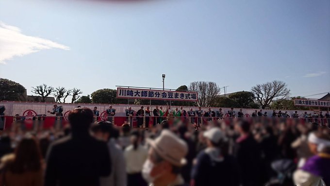 川崎大師 豆まき 14時ギリギリに到着して一番後ろで6袋ゲット。平日だからめっちゃ空いてるし、酔っぱらって子供にダイブしてくる 爺さんもいなかった😁 芸能人はこないらしい?