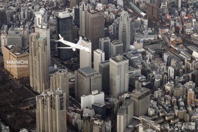 国土交通省は2日午後、東京都心を通過する羽田空港の新たな飛行ルートの「実機飛行確認」を始めました。写真は東京・新宿上空を飛行する航空機(撮影・藤尾明華)buff.ly/38Y86RF #羽田新ルート #新ルート #羽田空港 pic.twitter.com/h9bIVGHOeA