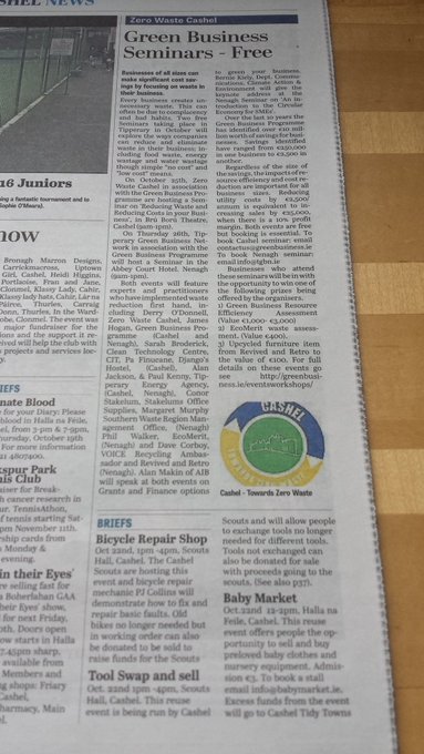 Great coverage again in this weeks @tippstar for #ReuseMonth. Green Business Seminar, Baby Market, Tool Swap & Bike Repair workshop pic.twitter.com/cfCJcS0qt4