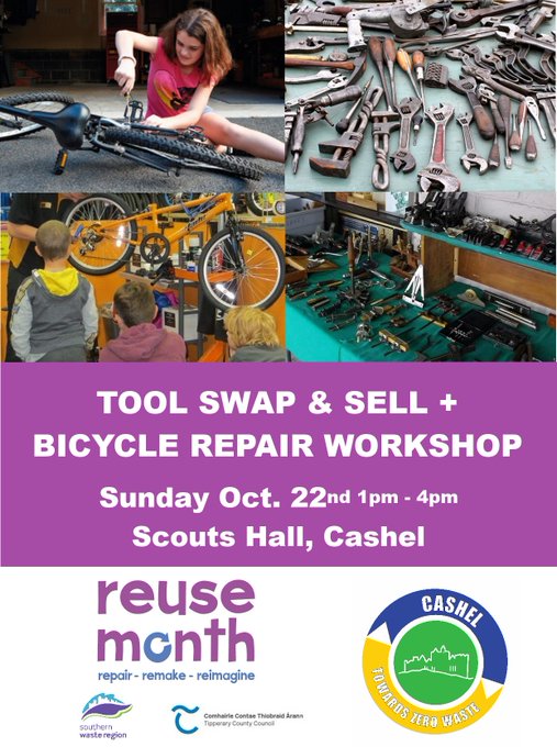 Don't Dump, Donate! Tool Swap and Sell and Bicycle Repair Workshop Sun. 22nd Oct as part of #ReuseMonth 1-4pm, in Scouts Hall, Cashel. pic.twitter.com/xzWqSmqssn