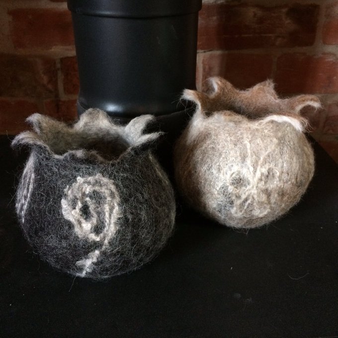 Two bowls felted out of our alpacas' fleece. Entirely sustainable. #ecocreatehour #alpacas #Sustainability pic.twitter.com/uWOXmAdUKX