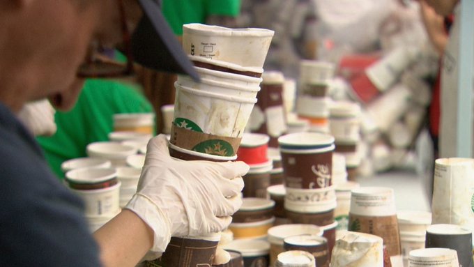 "Vancouverites throwout 2.6 million coffee cups every wk" (population= 631,000)