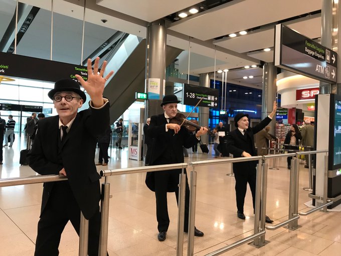 Passengers in T2 getting a warm, if somewhat unusual welcome from @AbbeyTheatre Ulysses cast #WhereStoriesGoBeyond pic.twitter.com/3eYTROdKpr