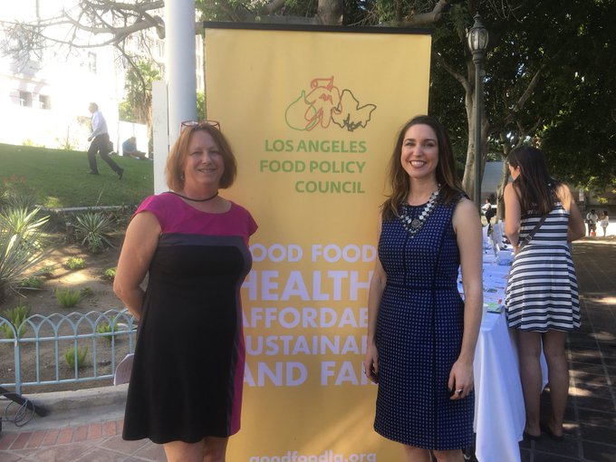 Karen Coca of the LA Bureau of Sanitation with @clarefoxinla at #FoodDayLA celebrating exciting steps toward #zerowaste #futureoffood pic.twitter.com/OX6JioZvYm