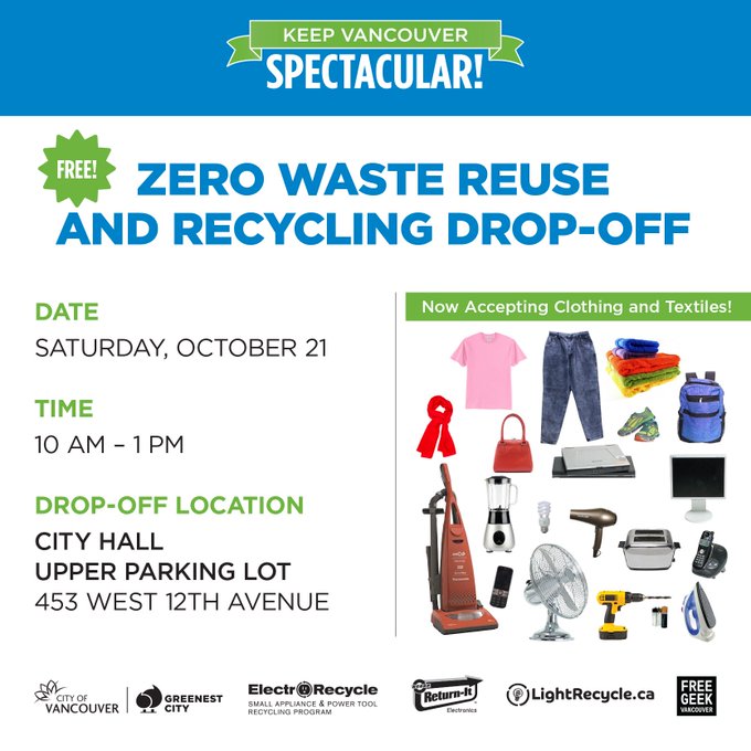 Recycling drop off event at City Hall - TOMORROW - Sat Oct 21. Bring us your stuff! #ZeroWaste #KeepVancouverSpectacular pic.twitter.com/xkcCvna5Si