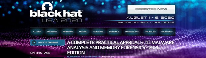 Happy to announce that again this year, we will be conducting 4-day hands-on training on malware analysis & malware hunting at #BHUSA. If you are interested in learning malware analysis & malware hunting, then register for the training: bit.ly/bhusma20 @BlackHatEvents pic.twitter.com/rhHcwLwEhE