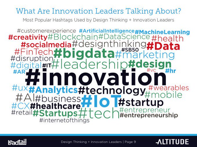 What are #innovation leaders talking about? #startups #tech #IoT #bigdata #fintech #UX #analytics #marketing #AR #CX #AI #designthinking pic.twitter.com/ebCJFVvx66