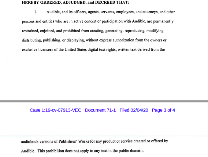 .@audible_com's #Captions settlement prevents it from displaying written text w/o publishers' authorization, except for public domain works. pic.twitter.com/KNY2n4APme