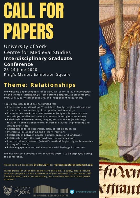 The York CMS Grad Conference Call for Papers is officially open! Good luck everyone. Go forth and abstract! Please send your 250-300 word proposals to yorkcmsconference@gmail.com by 23rd April! #cfp #medievalstudies #medievaltwitter pic.twitter.com/3RWZMLcnQF