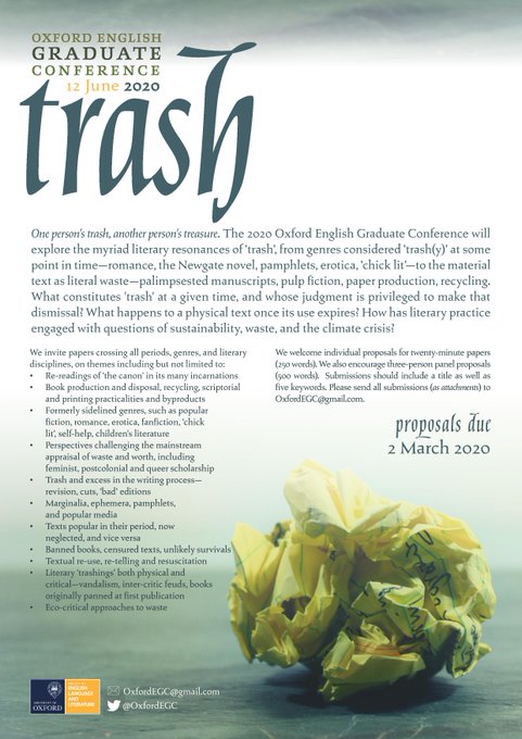 The Oxford English Graduate Conference is currently accepting paper and panel proposals! This year's theme is 'Trash'. Please send all submissions as attachments to OxfordEGC@gmail.com by 2 March 2020. #CfP @engfac pic.twitter.com/YuWrKOgg8l