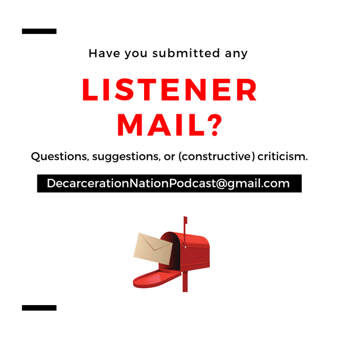 We love listener mail! Let us know what #CJReform issues are on your mind: DecarcerationNationPodcast[at]gmail.com pic.twitter.com/jceI0F9VzJ