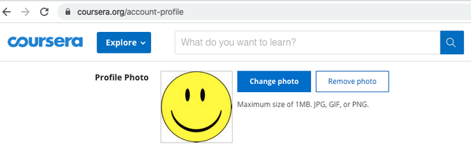 #coursera doesn't allow users to remove their profile photo. Wonder what the use case was: don't allow users to remove a photo (#darkpattern) or the thinking that users would only want to change their photo. I think a yellow smiley face would suffice for such a #UserExperience pic.twitter.com/KjF7NGHZxQ