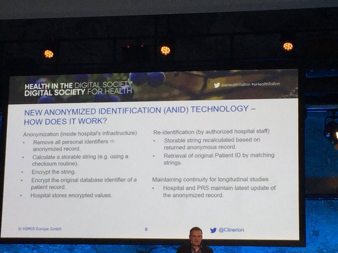 Anonymised identification: really interesting! @Clinerion @himsseurope @myhealthmydata @eHealthTallinn #eHealthTallinn pic.twitter.com/E5wdh3IcYh