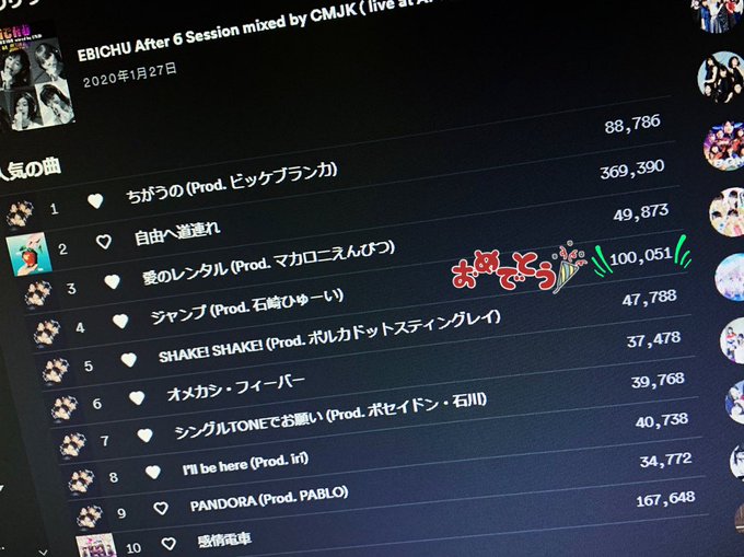 Spotify、エビ中playlistからジャンプが1番乗りで10万回再生突破してた🙌 #ebichu pic.twitter.com/JzamrFVvGJ