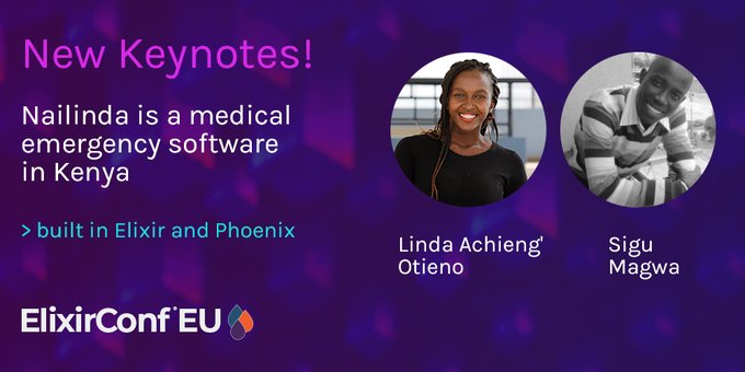 We've a joint keynote at #ElixirConfEU 2020 - we are pleased to have @KadzLyn and @s_igu join us - they'll talk about how #Elixirlang and #elixirPhoenix are being used to save lives in Kenya ow.ly/gf6C50y7PbI pic.twitter.com/5R9GcNw61E