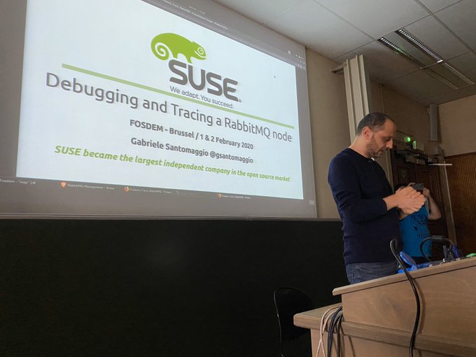 When you think you know something about #RabbitMQ, @GSantomaggio explains how to debug a RabbitMQ node and blow up your mind 🤯. Great talk with live code demo 😃. #FOSDEM2020 #Erlang pic.twitter.com/11bMMgGnCV