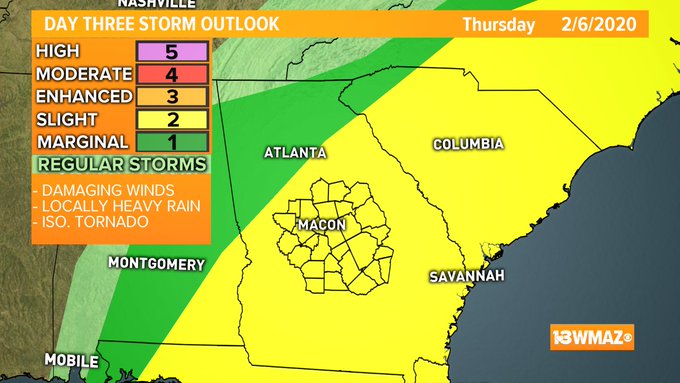 Come Thursday, Central Georgia is under a slight risk for severe weather. This threat is for the afternoon through the late evening. Damaging wind gusts will be the main and most widespread threat, but a brief isolated tornado cannot be ruled out. #gawx pic.twitter.com/lGpeZP3mad