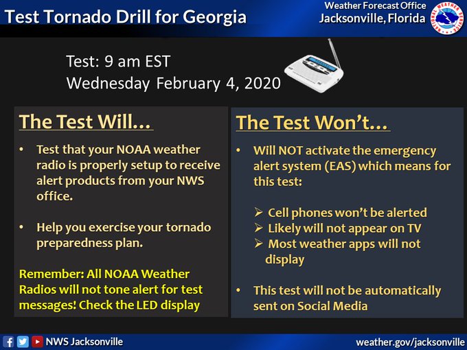 The Test Tornado Drill for the state of Georgia will be sent tomorrow at 9 AM EST in regards to Georgia's severe weather preparedness week.