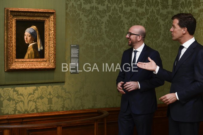 PM's @CharlesMichel and Mark Rutte looking at a famous girl. #begov #vermeer #belgaimage #girlwithpearlearring #NLBE pic.twitter.com/7CAcWfsRX4