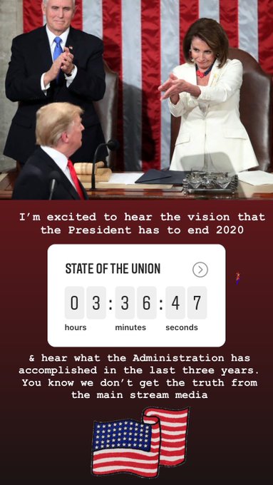 Can’t wait for the #StateOfTheUnion address tonight from @realDonaldTrump we know the country is doing great. But I can’t wait for him to own the Democrats with his success that they can take ZERO credit for as they’ve been too busy with their #ImpeachmentSham pic.twitter.com/jtJK5BlldX