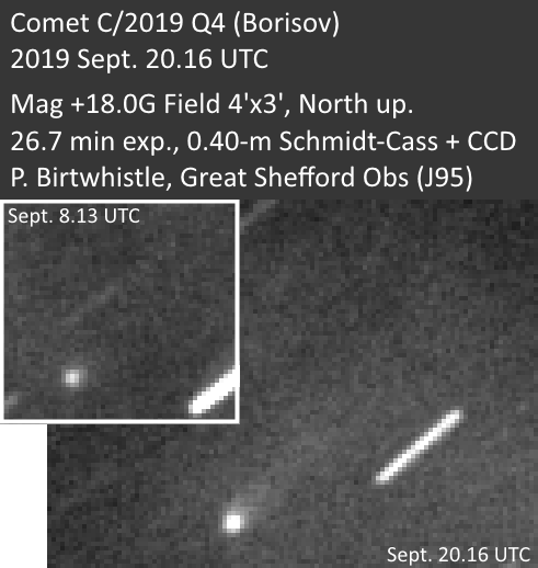 #InterstellarComet C/2019 Q4 (Borisov) taken with exactly same equipment and exposure shows noticeably more tail activity this morning than 12 days ago (inset), only 7% closer to Sun 2.67 AU today, down from 2.85 AU on Sept. 8. Perihelion at 2.0 AU in December. pic.twitter.com/HFLuLVqYR5