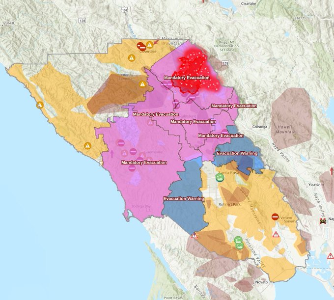 I have evacuees from west county here and the warning zone just moved a block from my house in Santa Rosa. How are we supposed to sleep...and where are we all supposed to go if it keeps moving south? #kinkaidfire