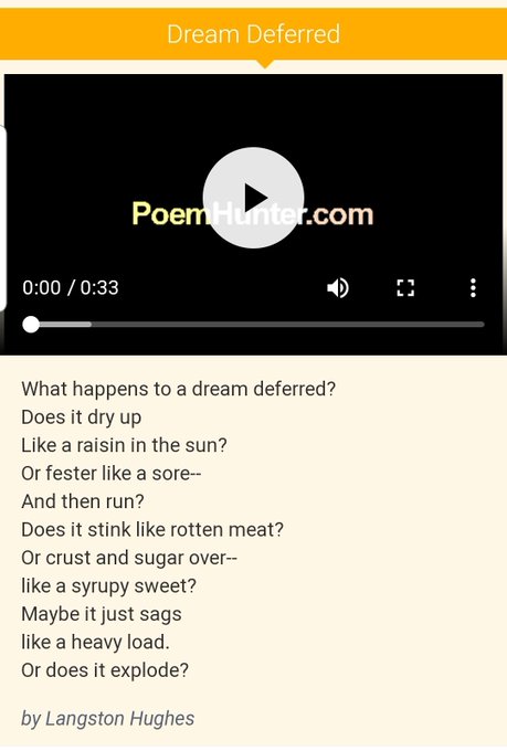 A Dream Deferred is my favorite poem ever. I read it in High School and been reading it every since. #LangstonHughes pic.twitter.com/CheZw3aW2P
