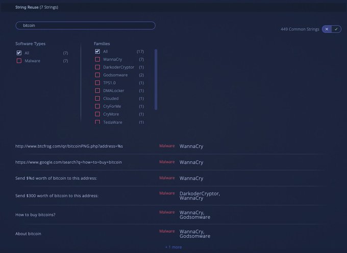 NEW in Intezer Analyze! Search for, filter & view string reuse between #malware families. Try it now by searching for 'bitcoin' in this WannaCry analysis: hubs.ly/H0mTfnt0 #malwareanalysis #DFIR pic.twitter.com/gQYaNqk1MB