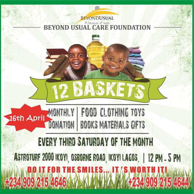 #12Baskets #MonthlyDonation Pls drop-off donations for the needy this Sat @ AstroTurf Ikoyi btw 12 & 5pm