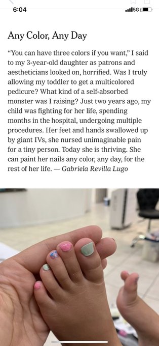 This #tinylovestory from @nytimes spoke to me. I never thought I would consider letting a 3 yo get a pedicure. But #pedpc teaches, every day is precious. It's hard to shake it when you leave the hospital. Sometimes you just want to spoil them. #motherhood #womeninmedicine pic.twitter.com/UbAn6rFwV4